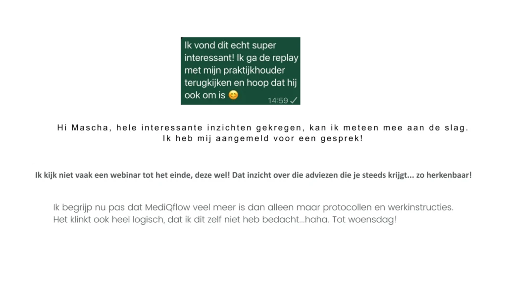 Als je na het webinar nog vragen hebt, kan je deze mailen naar hallo@mediQflow.nl.